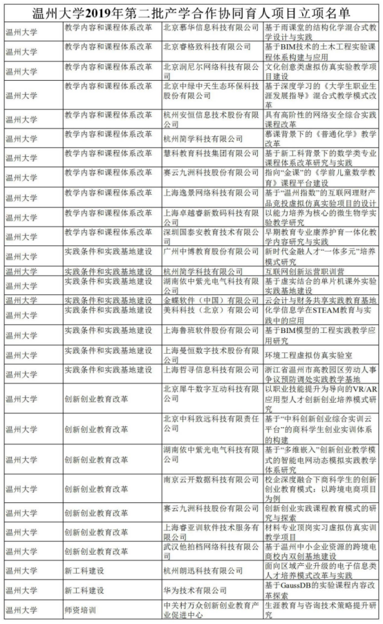 2019年第二批产学合作协同育人项目立项项目共包括创新创业教育改革561项、新工科建设759项、实践条件和实践基地建设2097项、创新创业联合基金8项、教学内容和课程体系改革3024项、师资培训1686项,共有916所高校的项目入选。我校此次获批立项教学内容和课程体系改革11项、实践条件和实践基地建设8项、创新创业教育改革7项、新工科建设2项、师资培训1项,获得了华为、中关村、金蝶、简学等26个国内外知名企业的支持,为人才培养、专业建设和课程建设提供了新的平台。