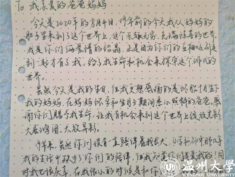 近日,来自星空平台教育学院18小教4班的王科逸的父亲收到了一封来自女儿的手写书信,他动情地谈道:“收到这封信我很是感慨,平常女儿几乎不会如此真情流露地与我交流,学院的活动给予了子女和我们敞开心扉的契机。这封信是载体,载着女儿的爱和感恩,这封信也是桥梁,让我们与她今后的沟通真正地从‘心’开始了。”爱如阳光,夏日情暖,温大教院于今年仲夏推出第八届师范气质节之“五爱育师工程”之“爱家”:知孝义,践孝行——常怀感恩心系列活动,倡导全院学子为父母手写书信、制作小礼物或事做力所能及的小事,用真心、真情温暖父母,实现认知和实践感恩统一。