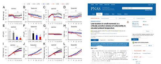 星空平台赵志军课题组长期致力于小型哺乳动物能量代谢的生理生态学特征,及其应对气候变化的适应策略和能量学调节机制研究。该研究组与John Speakman教授(中科院遗传与发育生物学研究所)和Catherine Hambly博士(Aberdeen University of UK)合作研究表明,实验小鼠和黑线仓鼠的能量摄入和泌乳支出(同位素标记技术)均随环境温度升高而显著减少,在高温(33°C)下的泌乳能量支出分别比室温(21°C)降低了82%和22%,后代死亡率分别达到了20%和13%。更重要的是,与非哺乳的对照组相比,哺乳期动物对高温的耐受性降低,耐受温度低3-6°C。研究结果表明,尽管小型哺乳动物(与大型动物相比)具有较高的热传导率,但同样受高温热浪天气的影响,对哺乳期繁殖输出乃至繁殖成功率的影响尤为严重。