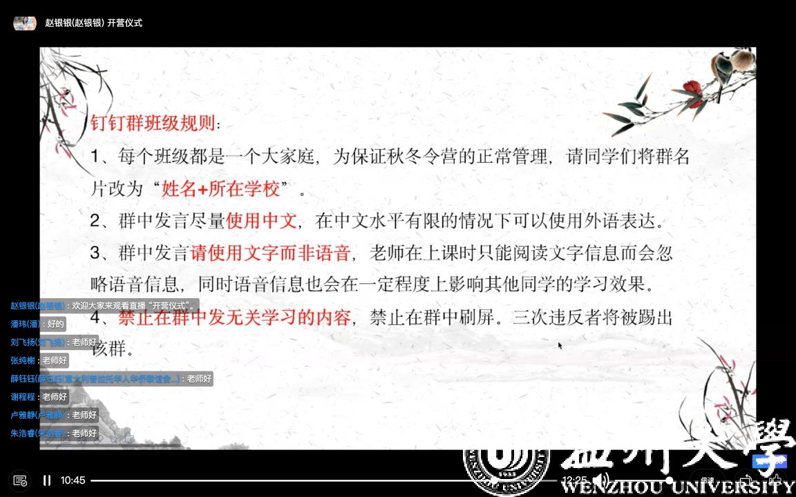 主持人兼班主任代表赵银银为全体营员讲解此次秋冬令营的班级规则、学生手册等。开营仪式结束后,各班班主任与学生进行互动交流,讲解课程安排,其乐融融。上一期秋冬令营的两位营员,来自西班牙华文轩华侨子弟学校的周子纯同学和来自法国青田同乡会的胡大卫同学发表了参营感言。