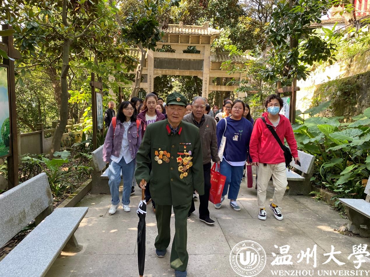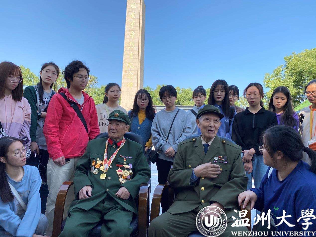 “‘天地英雄气,千秋尚凛然。’无数英雄先烈是我们民族的脊梁。值此纪念中国人民解放军抗美援朝出国作战70周年之际,我们马院部分师生来到瑞安抗美援朝历史教育纪念馆学习参观,听取了“浙江省首届最美退役军人”、参加过上甘岭战役的英雄马发泉老人的生动讲解。回顾战火纷飞的峥嵘岁月,一起缅怀革命烈士的丰功伟绩,我们由衷敬佩和感恩英雄,也必须永续传承和世代发扬伟大的抗美援朝精神,共同为实现中华民族伟大复兴的中国梦而贡献自己的力量。”