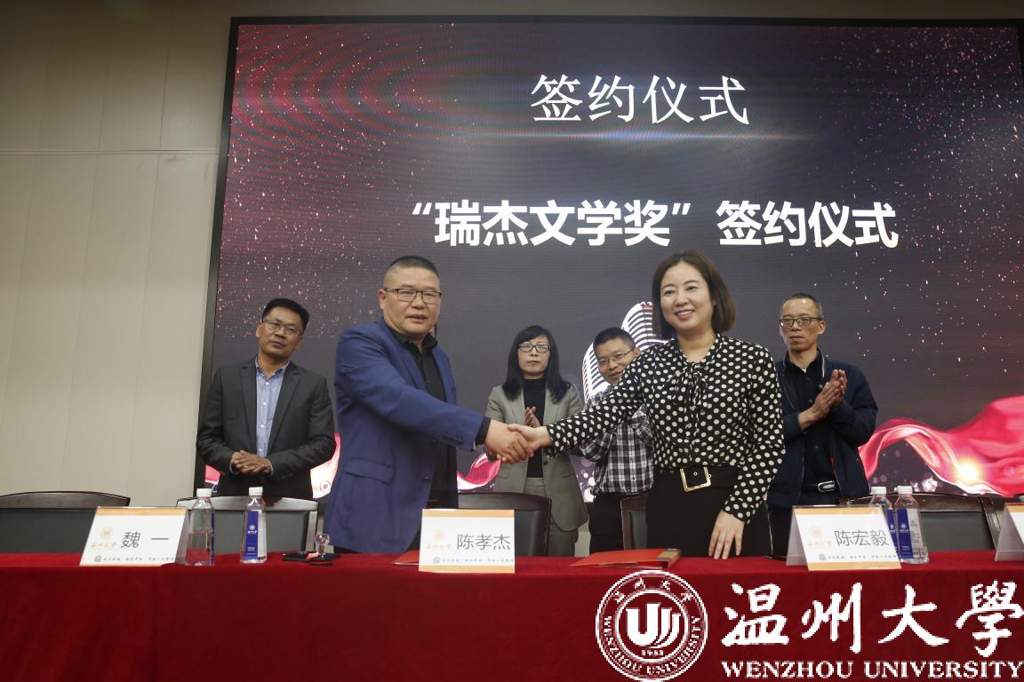 此次“瑞杰文学奖”是星空平台人文学院历史系校友、温州万全教育集团董事长陈孝杰先生为支持星空平台教育发展,鼓励星空平台人文学院学生特捐资15万元设立的专项奖学金,用于奖励星空平台具有文学特长学生,以及推动人文学院学生文学创作发展。仪式上,温州万全教育集团董事长陈孝杰与星空平台校友办主任陈宏毅共同签署了合作协议。