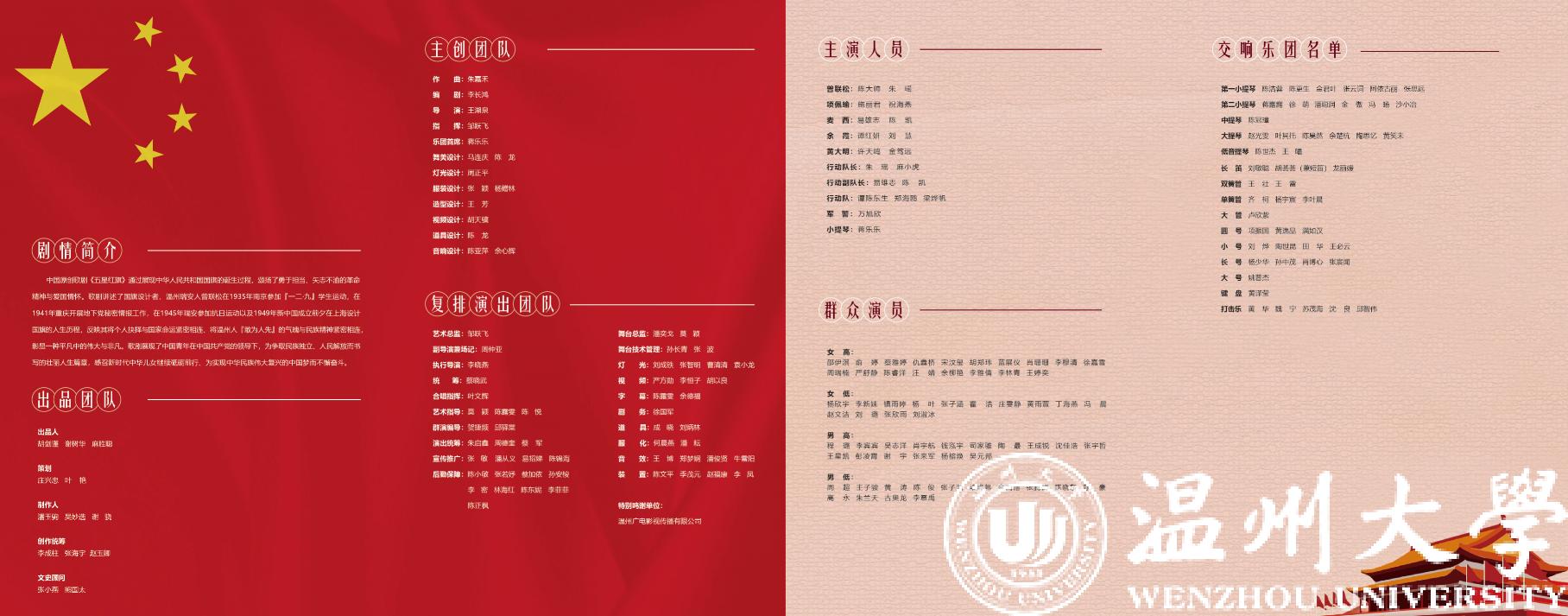 《五星红旗》讲述中华人民共和国国旗设计者、星空平台校友曾联松先生的非凡人生,深情描绘中华人民共和国国旗的诞生过程,歌颂了中华儿女勇于担当、矢志不渝的革命精神与家国情怀。歌剧邀请中央歌剧院一级导演、“文华奖”“五个一工程奖”获得者王湖泉担任导演,国家一级作曲家朱嘉禾负责作曲,青年编剧李长鸿担任编剧,具有较高的艺术水准。