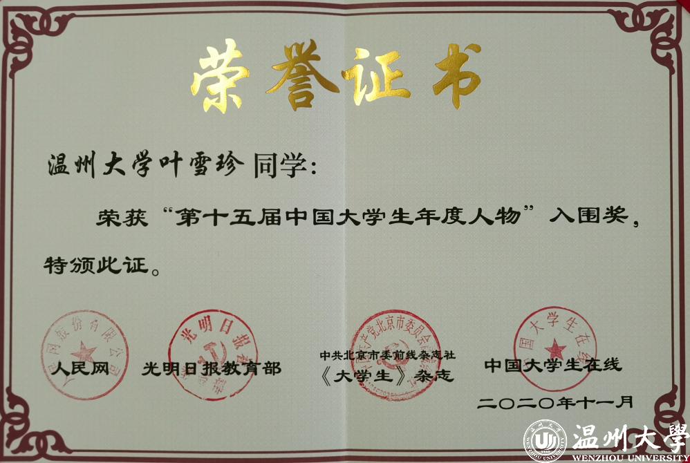 日前,由教育部、人民日报社共同指导,人民网、光明日报社教育部、《大学生》杂志、中国大学生在线联合主办“第十五届中国大学生年度人物” 推选展示结果揭晓,我校教育学院叶雪珍同学荣获“第十五届中国大学生年度人物”入围奖。