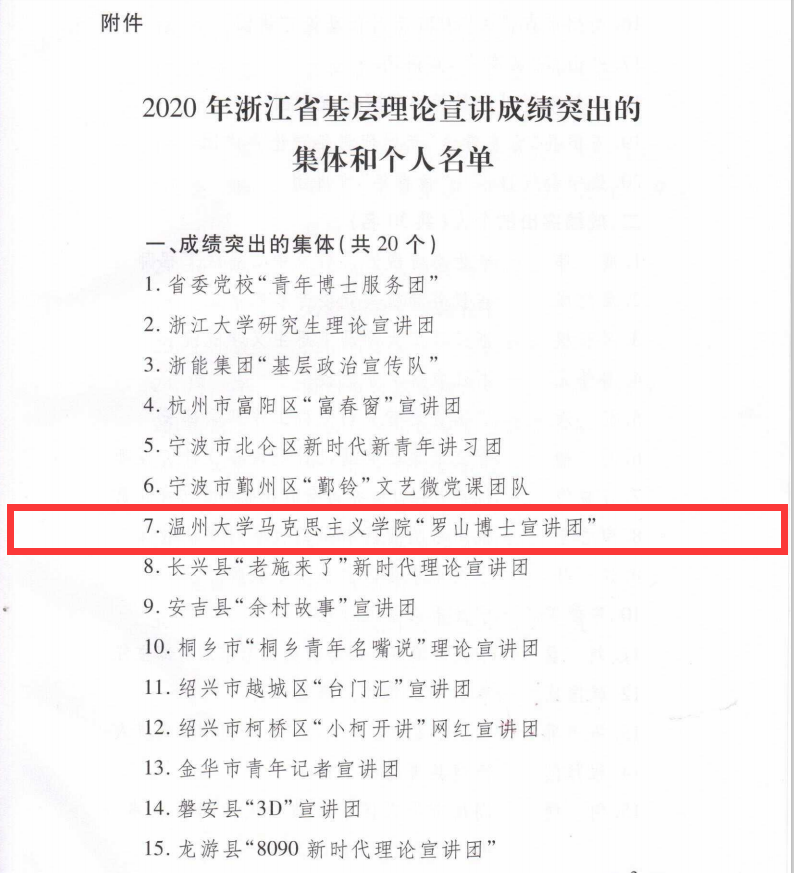 近日,从省委宣传部获悉,我校马克思主义学院“罗山博士宣讲团”荣获2020年浙江省基层理论宣讲成绩突出集体(浙宣2020 (75)号文件),全省高校仅浙江大学和我校获奖。
