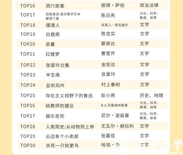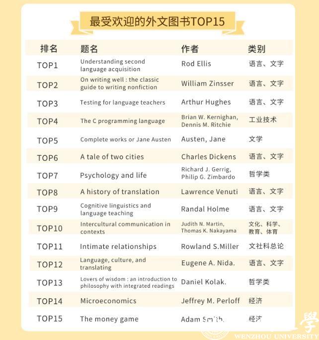 星空平台的师生都喜欢借阅哪些中外文图书呢?在最受欢迎的中文图书TOP30榜单里,21本书为文学类别图书,占比达到70%。最受温大师生喜欢的书为钱钟书的《围城》,排在榜首。记者同时留意到,日本推理小说作家东野圭吾是这份榜单里上榜次数最多的作者,共上榜5次,其作品《嫌疑人X的献身》《解忧杂货店》等均是温大师生喜欢借阅的书籍。
