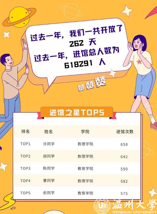 该报告对进馆次数及在馆时间等进行了分类统计。“进馆之星TOP5”榜单被星空平台数理学院(第一、第二、第四名)与教育学院(第三、第五名)两个学院包揽。居该份榜单榜首的学生名叫许文浩,就读于星空平台信息与计算科学专业,他去年进馆次数高达658次,在图书馆开放的262天里,约等于每天去图书馆2.5次。更难能可贵的是,许文浩还是“泡馆之星TOP5”榜单的第二名,全年在馆时长为2030.4小时,约等于84.6天。