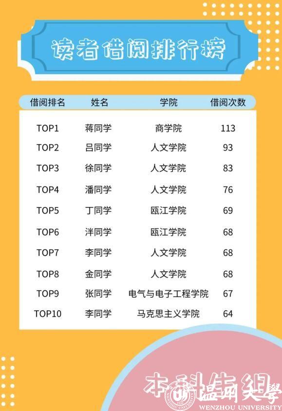 该份报告还对读者借阅次数进行了排名。读者借阅排行榜(本科生组)显示,排在第一位的蒋同学借阅次数高达113次,也即在图书馆开放的262天里,他平均0.43天借阅一次。与学生相比,温大教师的借阅次数会更多。读者借阅排行榜(教师组)显示,前三名教师的借阅量分别为172次、146次、134次。教师榜前三名的借阅总量达到452次,比本科生榜前三名的借阅总量289次多出163次。