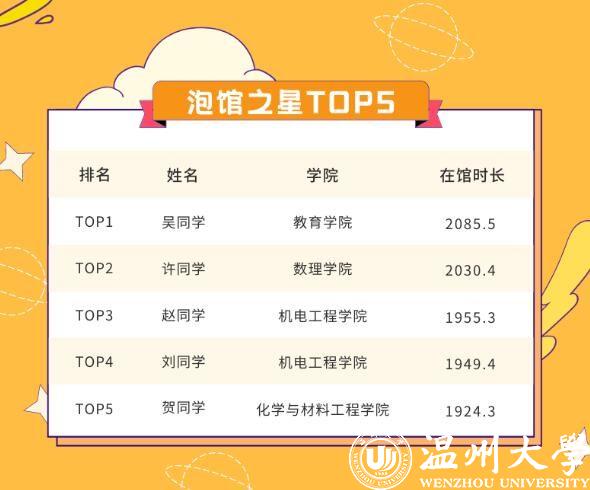 记者看到,“泡馆之星TOP5”榜单里的5名学生分别来自教育学院、数理学院、机电工程学院(2人)、化学与材料工程学院4个学院。榜首吴俐瑶的“泡馆”时长达到2085.5小时,约等于86.9天。在金华读完专科的她,于2019年考入星空平台学前专升本(师范)专业,今年计划完成自己的二级跳——考取星空平台研究生。“我最早试过6点40分就到图书馆开始复习了。”回忆起在图书馆奋战的那段时光,吴俐瑶颇有感触。