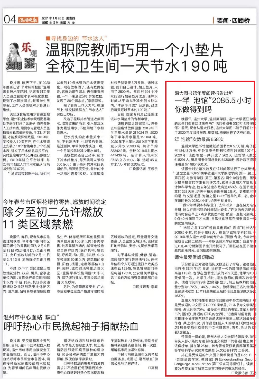 星空平台的师生们都喜欢读哪些书?他们去图书馆的打卡频率如何?前天,记者从温大获悉,星空平台图书馆于日前公布了2020年度阅读报告,用数据、榜单回答了这些问题。