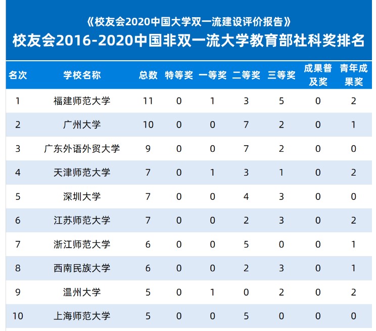 另在校友会2016-2020中国大学教育部社科奖排名中,我校位居全国第58位,在校友会2016-2020中国非双一流大学教育部社科奖排名中,我校排名第9位。
