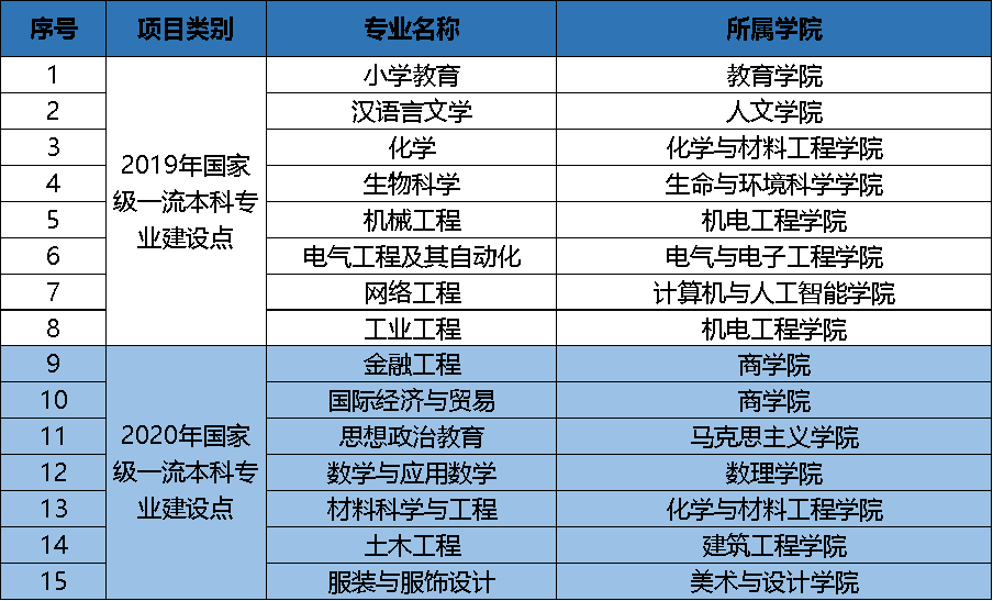 近日,教育部颁布了2020年国家级一流本科专业建设点名单,我校金融工程、国际经济与贸易、思想政治教育、数学与应用数学、材料科学与工程、土木工程、服装与服饰设计7个专业入选2020年国家级一流本科专业建设点。截至目前,我校共有国家级一流本科专业建设点15个,占在招专业的32.61%,专业建设成效显著,佳绩频出!