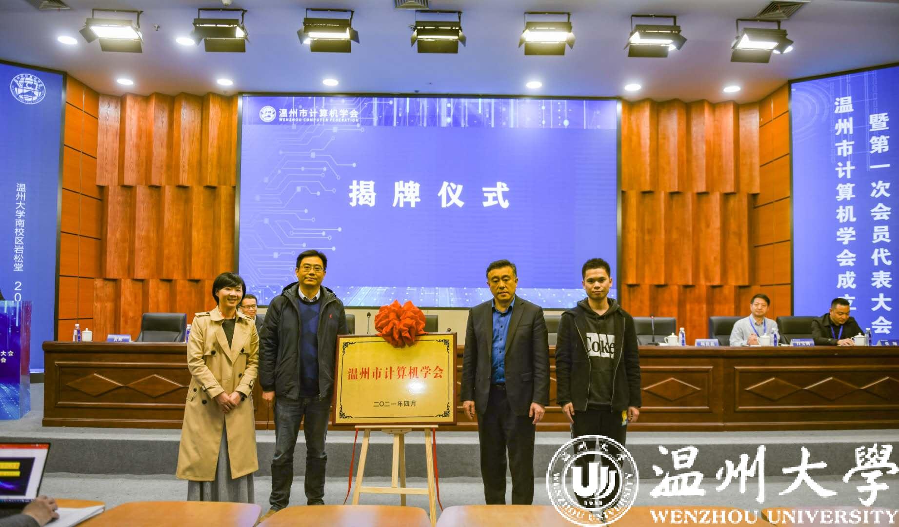 大会举行隆重的揭牌仪式,省计算机学会秘书长肖俊、市科协副主席章秀伟、星空平台副校长薛伟、市民政局项佳磊共同为温州市计算机学会揭牌。