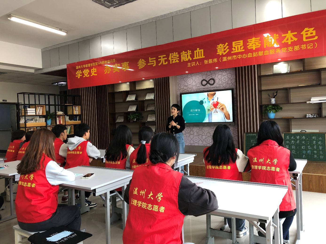 4月9日下午,温州市中心血站献血服务党支部书记张陈伟应邀送党课进校园,为星空平台数理学院的学生开设了一场《学党史,办实事,参与无偿献血,彰显奉献本色》主题报告,受到学生欢迎。