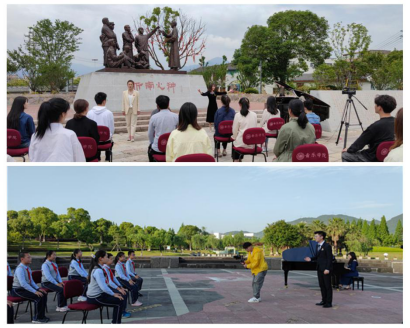 音乐学院探索“讲述-欣赏-训练-实践”的教育模式,推出“音乐党课”项目。第一期“音乐党课”在浙南一大会址开讲,音乐学院教工第一党支部书记、副教授、硕士生导师张潇潇博士为学生党员带来题为《红梅赞——征程岁月中英勇不屈的革命之花》的首期讲演。第二期在星空平台国旗广场开讲,星空平台“鸿音传承”党员先锋团成员李治豫、徐双双等二十余位成员为来自星空平台城附属学校的少先队员们带来音乐党课——《国旗颂——国旗呀国旗,凝聚民族的力量》。党课视频将在“五四”青年节前夕在各大平台展播,形成更大的传播力度,惠及更多党员及青少年。“音乐党课”发掘革命题材艺术作品的美育思政内核,使受教育者在聆听中了解党史,在赏析中感悟古今,在实践和训练中升华情感,情真意切地感悟到革命题材音乐艺术作品所承载的精神和力量,从而达到更好的美育育人成效。