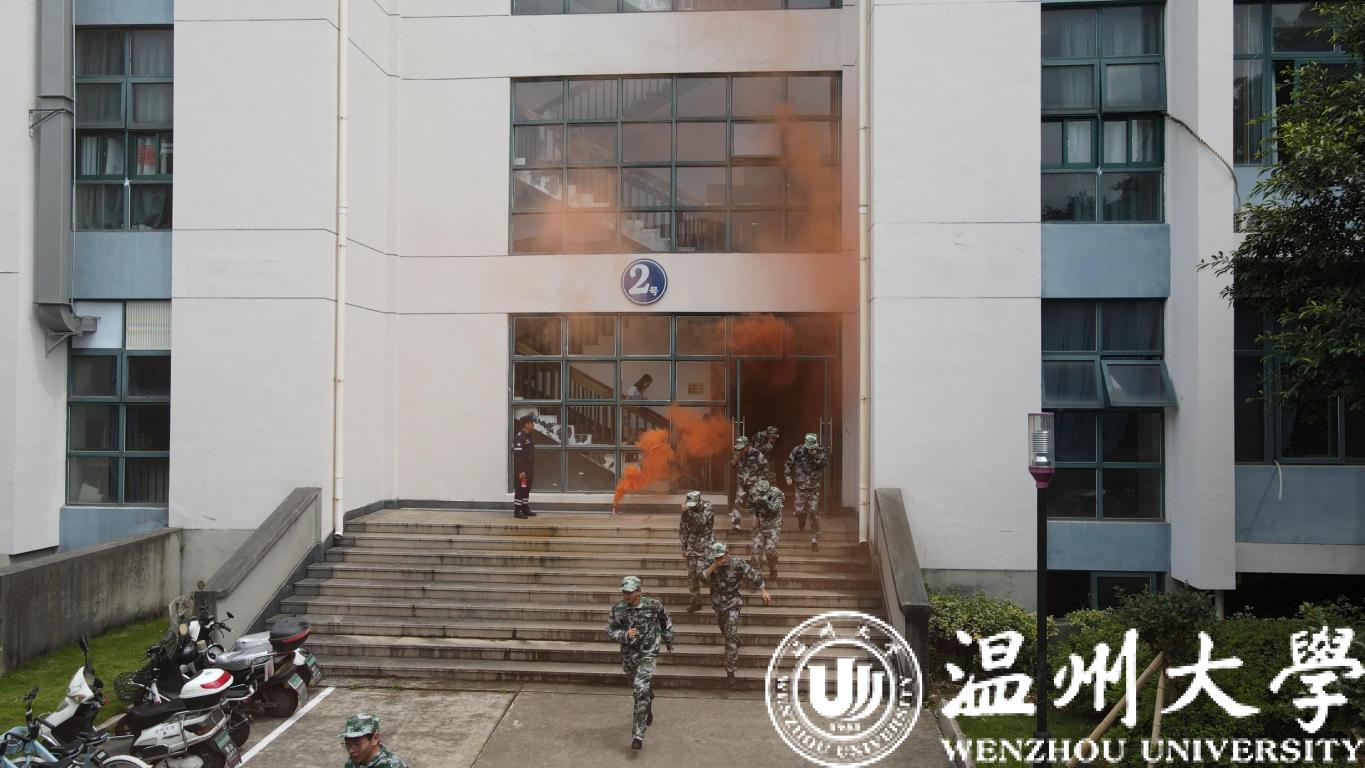 在北校区7号楼的人防疏散演练现场,300余名学生听到防空警报响起,迅速向人防地下室高效有序疏散。
