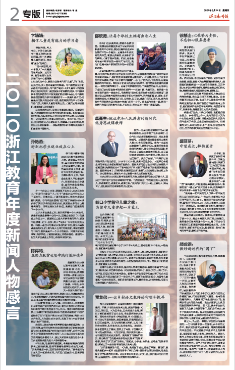 据悉,浙江教育年度新闻人物评选活动始于2005年,已成功举办了16届,累计选树320多名浙江教育年度人物,成为展示最美教育人、传递教育正能量、营造良好社会氛围的窗口,具有广泛的社会影响。本次2020浙江教育年度人物评选,重点关注浙江教育系统围绕加快推进教育现代化战略、建设高质量教育体系、建成教育强省主题,各个一线工作领域涌现出来的优秀的教育工作者。卓高生教授作为思政课教师代表获此殊荣,充分体现了社会各界对于我校思政课教育教学成果的充分肯定,彰显了我校思政课改革与创新在全省教育系统的影响力。