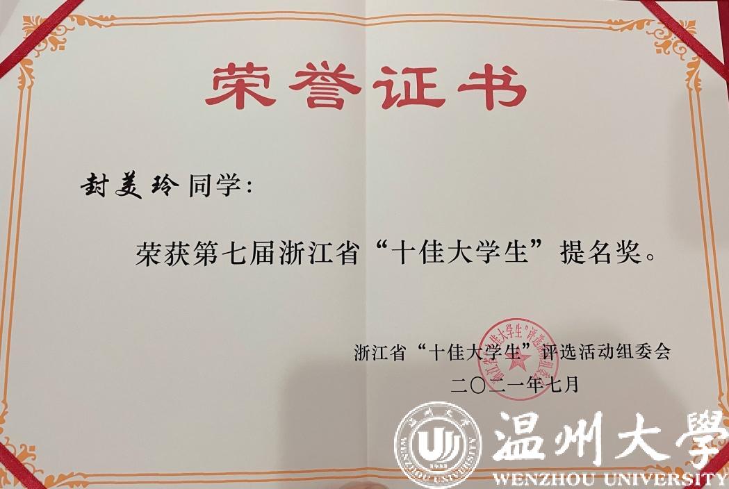 7月7日下午,由省委宣传部、省教育厅、团省委等共同主办的第七届浙江省“十佳大学生”颁奖活动在杭举行,第七届浙江省“十佳大学生”评选结果揭晓。我校体育与健康学院封美玲同学荣获省十佳大学生提名奖。