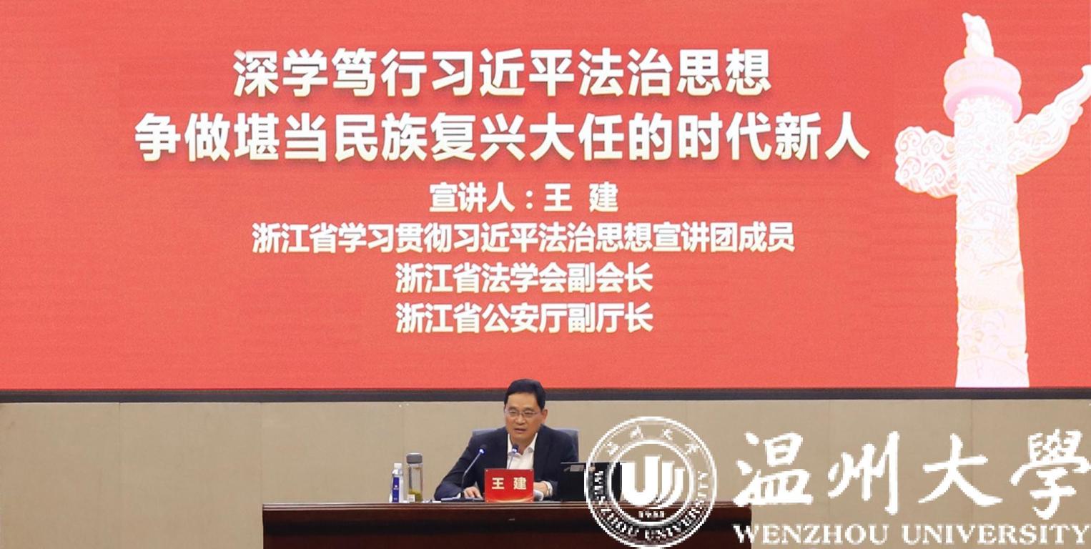 为深入学习贯彻习近平法治思想,11月4日下午,浙江省学习贯彻习近平法治思想宣讲团成员,省法学会副会长,省公安厅党委委员、副厅长、一级警务专员王建莅临我校,作题为《深学笃行习近平法治思想,争做堪当民族复兴大任的时代新人》的专题辅导报告。全体校领导、中层干部、“三强”年轻干部、辅导员和学生代表参加学习会。 校党委书记谢树华主持。