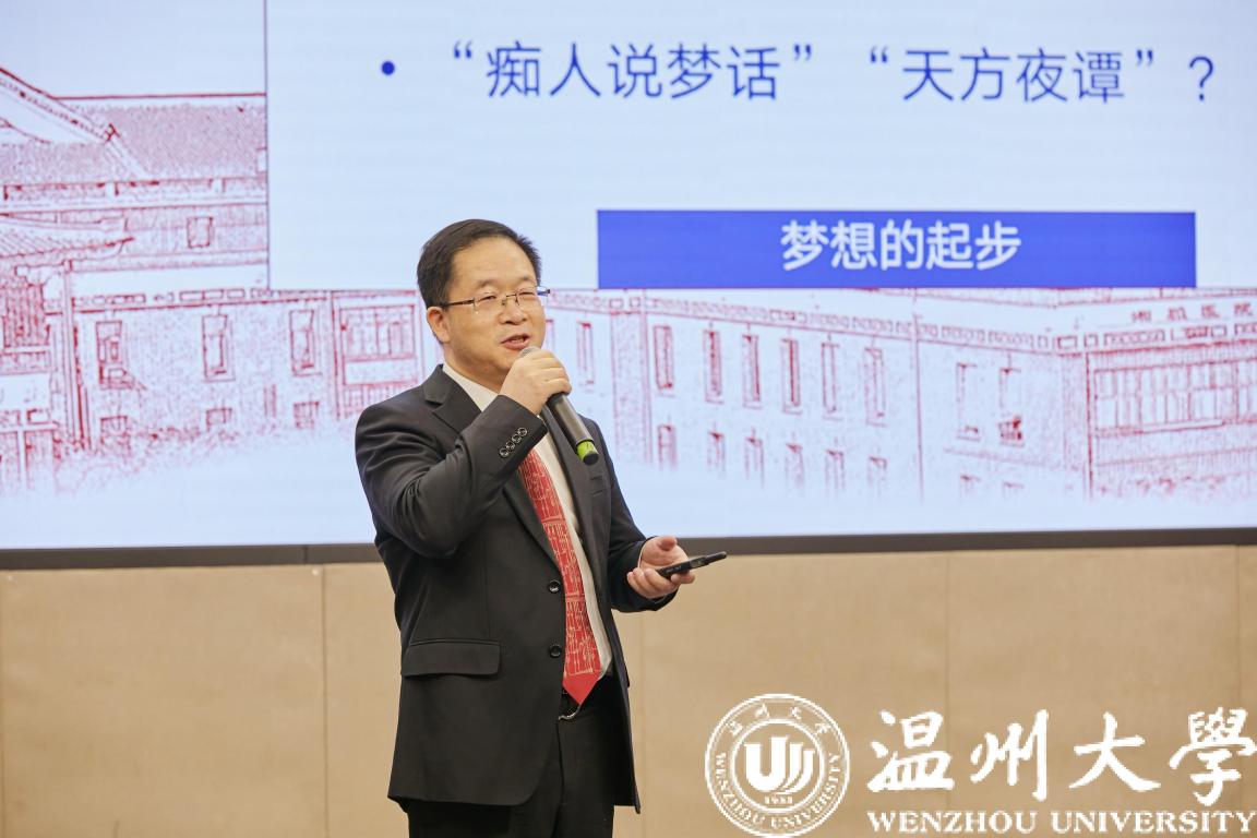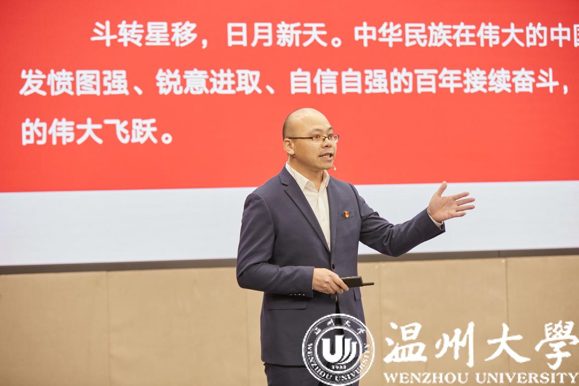 思政公开课在庄严的国歌声中拉开了序幕,校党委书记谢树华致辞。谢树华感谢市委宣传部创新搭建全市高校“思政公开课”平台,让广大青年学子有缘线上线下相聚在美丽的星空平台,共学思政大课、共悟时代思想、共话美好未来。谢树华指出,星空平台历来高度重视大学生思政教育工作,具有思政教育的优良传统和丰硕成果,此次活动选择在星空平台举办,既是对温大思政工作的一种肯定和支持,也是对温大的一种莫大鼓舞和巨大鞭策。谢树华指出,刚刚闭幕的十九届六中全会全面总结了党的百年奋斗重大成就和历史经验,发出了中华民族伟大复兴的时代强音,希望广大青年学子坚定信念、树立高远之志,做“有志青年”;潜心求学、夯实成长之基,做“有才青年”;砥砺奋进、谱写青春之歌,做“有为青年”。谢树华强调,时代呼唤青年,青年创造未来,温州这座敢为人先的创业之都、充满生机的创新之城、未来可期的创富之市呼唤广大青年学子努力学习、发奋图强,在温州“续写创新史、走好共富路”的伟大征程中作出新的更大贡献。