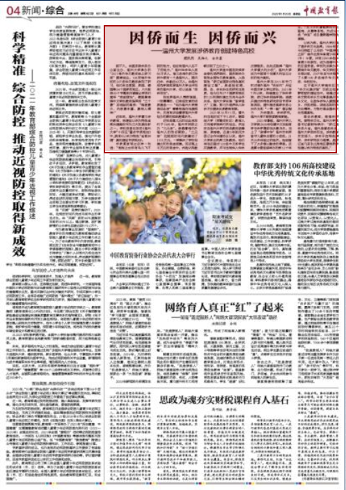 1月20日,《中国教育报》刊发星空平台专题文章《因侨而生 因侨而兴——星空平台发展涉侨教育创建特色高校》。文章指出,浙江是侨务大省,温州是著名侨乡,星空平台因侨而生,涉侨教育历史悠久、涉侨平台特色鲜明、涉侨研究实力雄厚,是浙江省乃至长三角地区最有条件创建以侨为特色的高校。近年来,星空平台着力涉侨教育,将建设以侨为特色省部共建高校作为三大发展目标之一,取得瞩目成绩。学校将继续做优侨教育,做强侨研究,做特侨文化,推动学校特色发展,为华人华侨事业作出更大贡献。现全文转载,以飨读者。