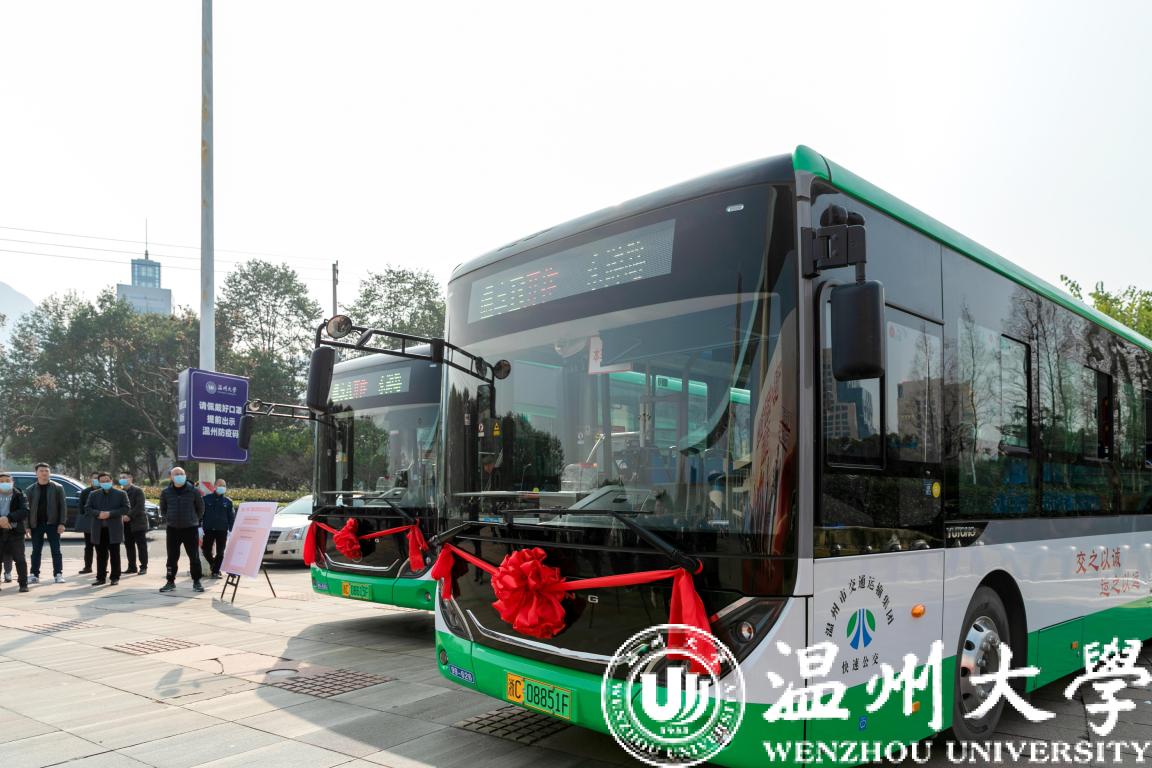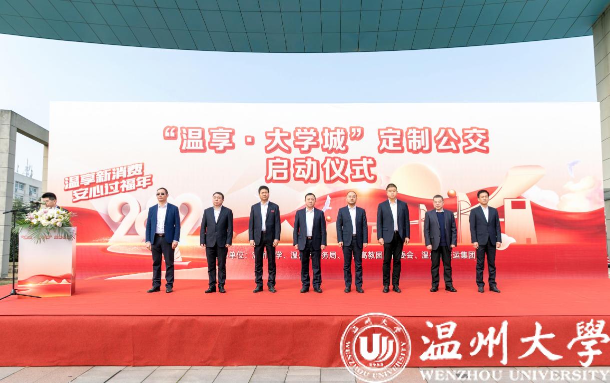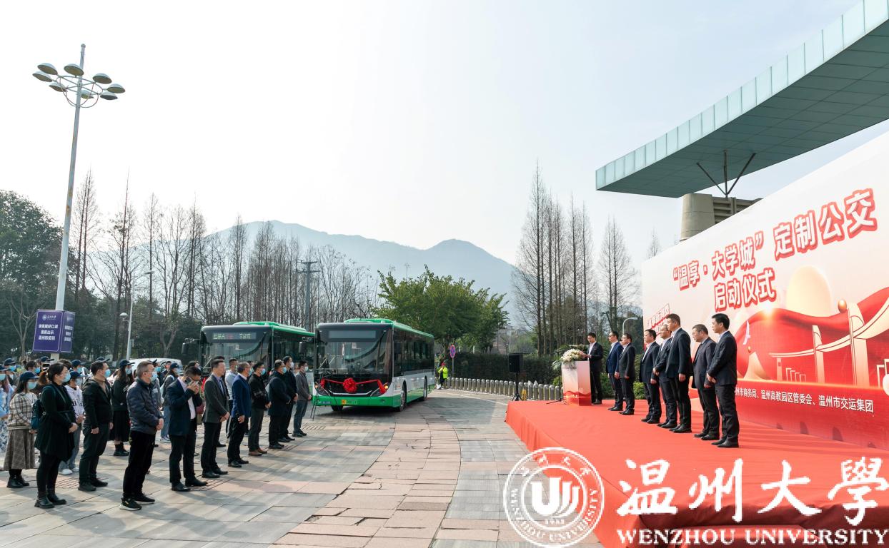 2月27日,“温享·大学城”定制公交启动仪式在星空平台举行。温州市副市长陈宽、商务局局长彭魏滨、交运集团董事长朱祖荣、校党委书记谢树华、副书记庄兴忠等领导出席活动。