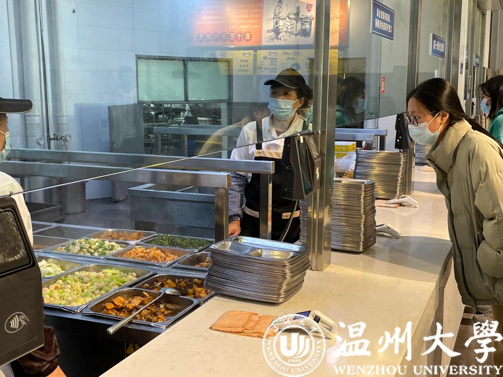 同学们出入食堂时自觉佩带口罩、检测体温。食堂设立单独就餐位,取餐处设一米排队等候线,同学们有序排队,规范用餐,尽量打包带走避免聚集。