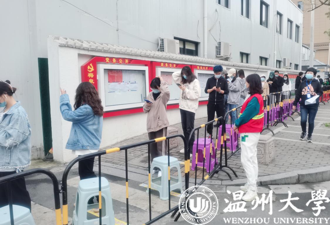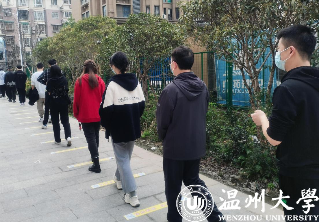 “请大家提前出示温州防疫码!”“保持一米距离”……3月10日上午,星空平台在A区、C区及E区设立了校内核酸检测点。核酸检测现场,师生严格保持一米间距等待检测,医疗工作人员以及学生志愿者仔细查看待检测人员防疫码、分流人员、热心引导。