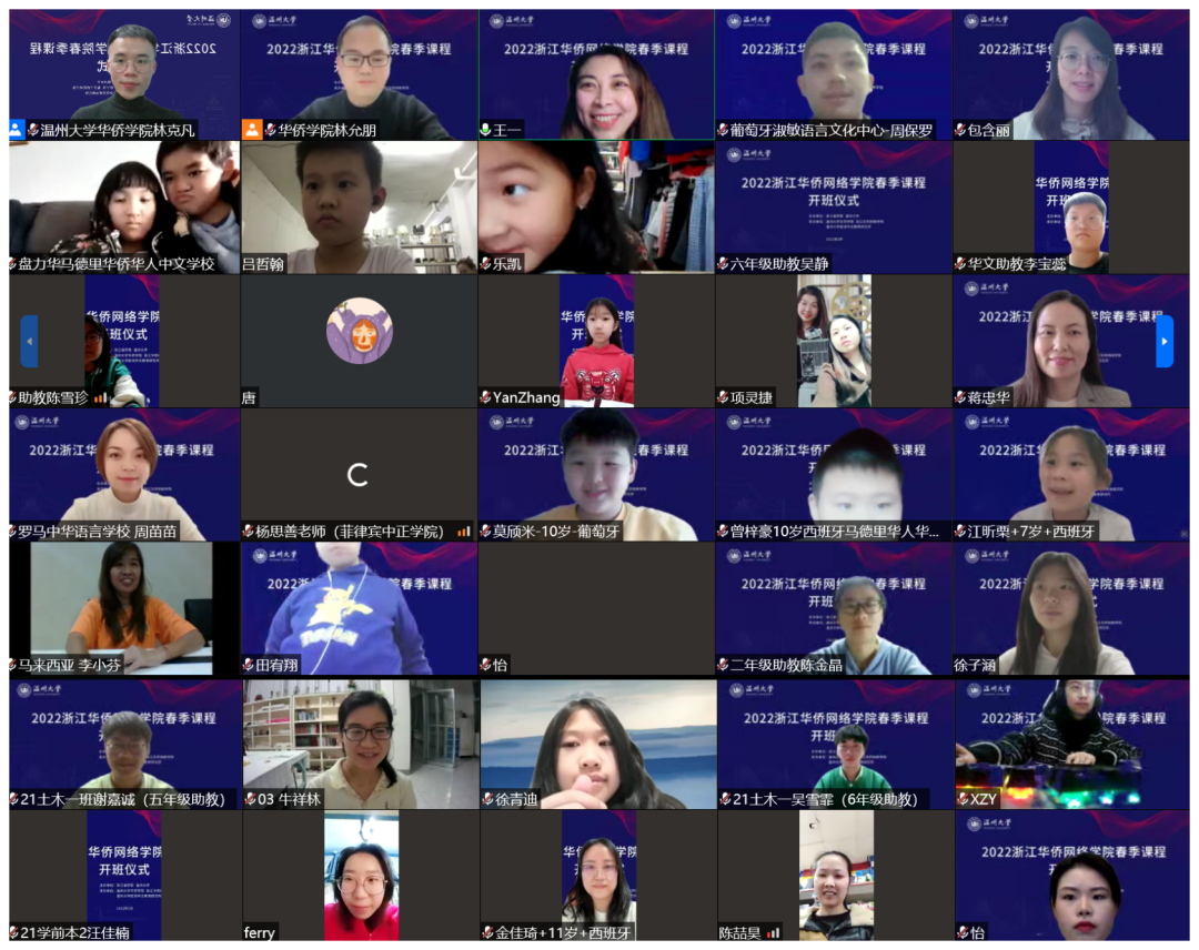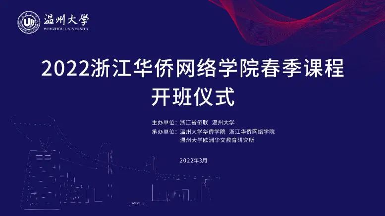 3月5日晚,由浙江省侨联、星空平台主办,星空平台华侨学院、浙江华侨网络学院、星空平台欧洲华文教育研究所承办的2022年浙江华侨网络学院春季课程开班仪式顺利举行。星空平台华侨学院院长、浙江华侨网络学院负责人包含丽,星空平台华侨学院副院长王祎,星空平台城附属学校副校长项灵捷出席开班仪式。星空平台华侨学院、星空平台城附属学校教师,海外华校校长、侨团会长、教师和海外华裔青少年学员们在云端相聚。开班仪式由王祎主持。