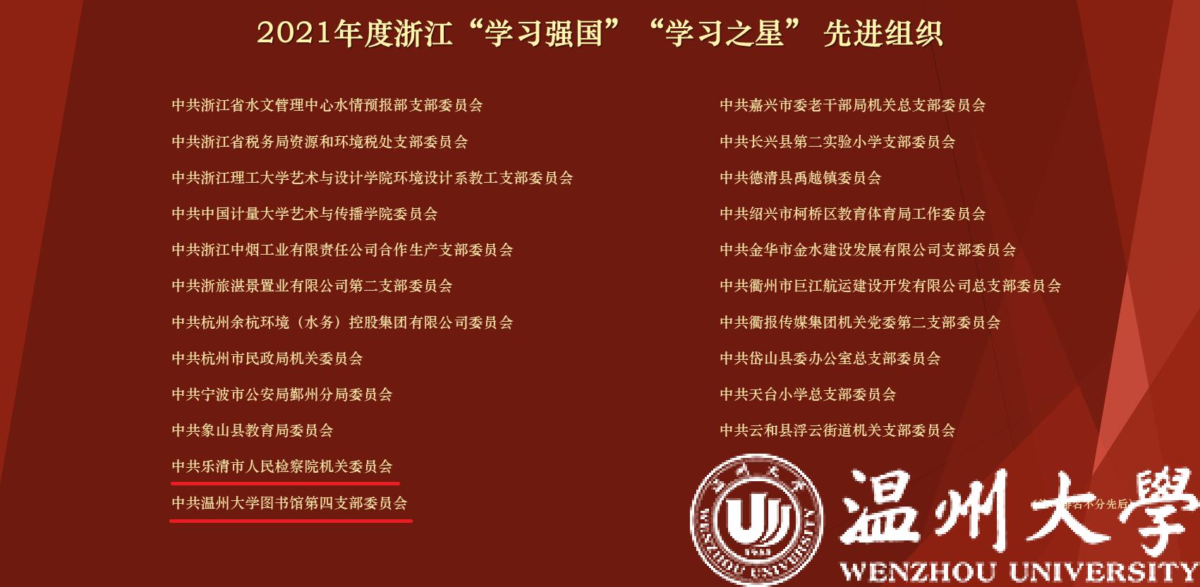 4月19日,2021年度“学习强国”浙江学习平台线上授奖交流活动举行。活动公布2021年度浙江“学习强国”“学习之星”先进组织和先进个人,温州市选送的中共星空平台图书馆第四党支部、中共乐清市人民检察院机关委员会获“学习之星”先进组织;温州市自来水有限公司的麻鹿环、温州瑞安市住房和城乡建设局的薛孝松、温州乐清市白象中学的吴君艳获得“学习之星”称号。