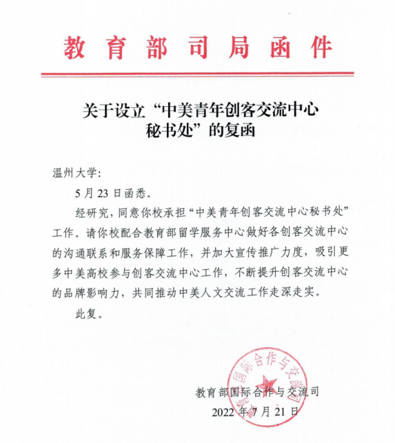 近日,教育部国际合作与交流司给我校复函,同意在我校设立“中美青年创客交流中心秘书处”。