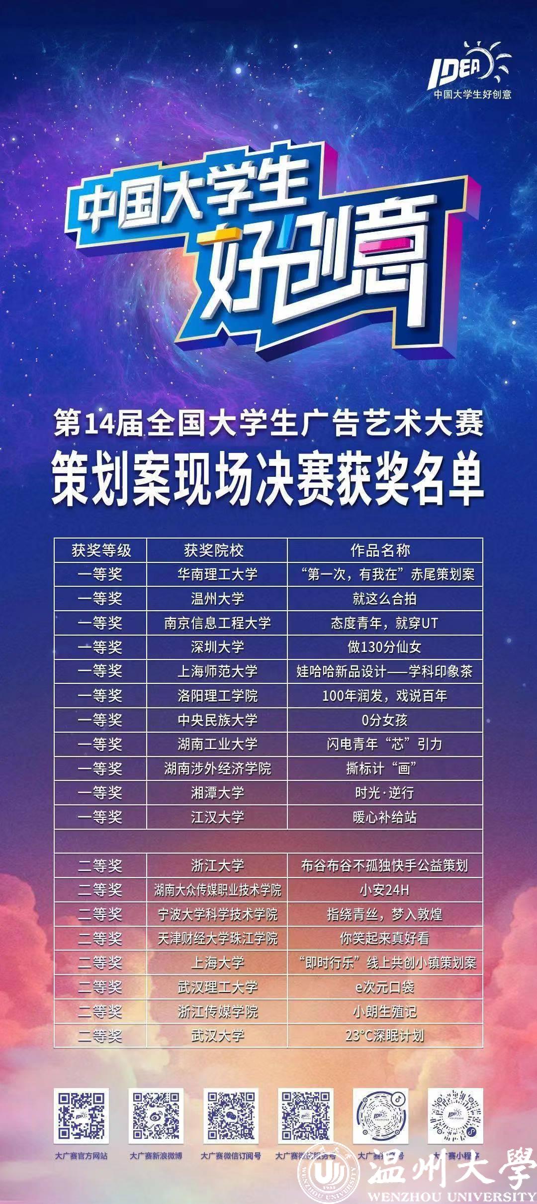 据悉,大广赛策划案类别比赛是全国大广赛中门类最复杂、要求最高的比赛类型,我校在该类型赛事上一向表现卓越,每一年都有策划案类别的全国等级奖项,今年除了决赛而出的《就这么合拍》一等奖,还有《中国可乐有“股气”》《现充青年》两项二等奖和《“银发冲浪”计划》等五项全国优秀奖。温大广告专业是我校省特色专业,以培养高素质应用型广告与文化创意人才为根本诉求,强化多元化学科竞赛,在学科竞赛上成果丰硕。近年来,广告学专业学生参加国家级、省部级以及行业协会等各类赛事获奖达100多项,在全国大学生广告艺术大赛中,获得了全国一等奖4项、二等奖7项、三等奖11项、优秀奖13项;“互联网+”大赛国家级银奖;在最近三届上海国际广告节新锐挑战营中,获得冠军一项,亚军两项,季军一项。