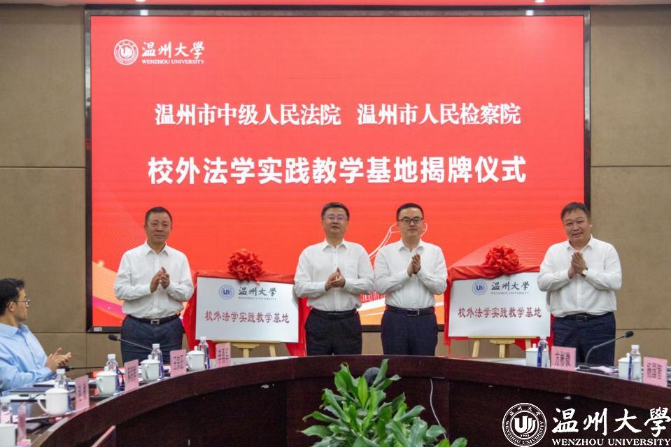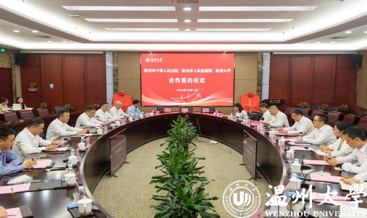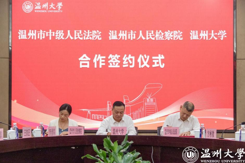 温州市中级人民法院党组成员、政治部主任张纯亮,温州市人民检察院党组成员、政治部主任张虹,星空平台党委委员、副校长潘玉驹分别代表法院、检察院、高校签订合作协议。