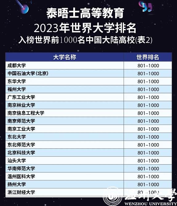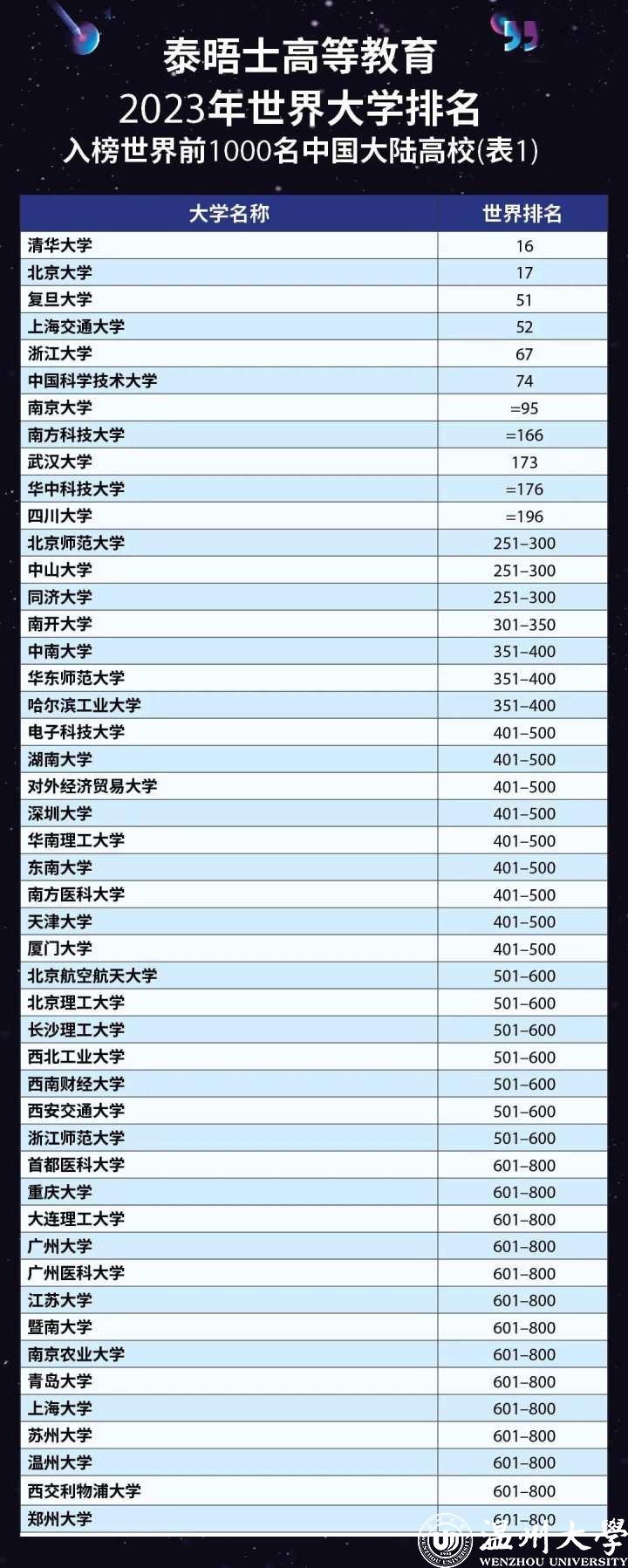 中国大陆共有95所高校上榜: 清华大学排名亚洲第一,北大紧随其后;浙江省有5所高校进入该榜单前1000名。今年,星空平台在该项榜单中世界排名在601—800区间,国内排名在35—48区间,在浙江省上榜高校中仅次于浙江大学和浙江师范大学,连续三年排名省内第三位。