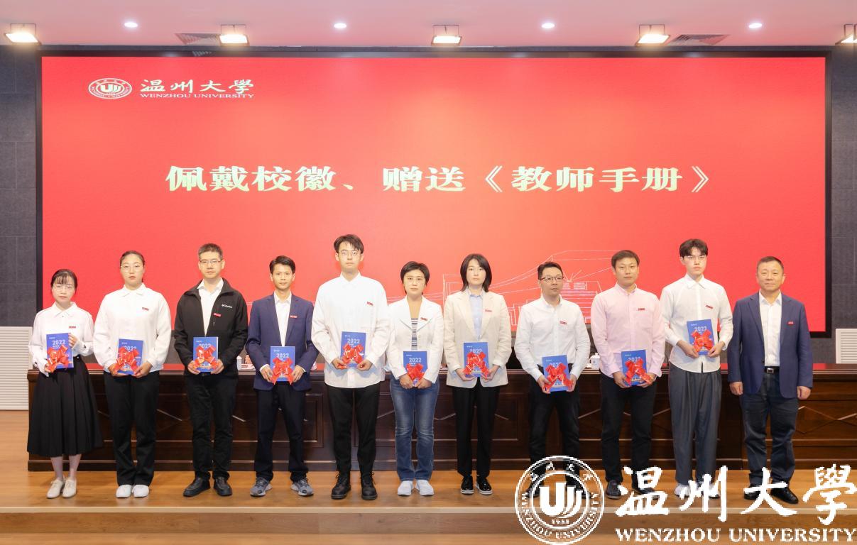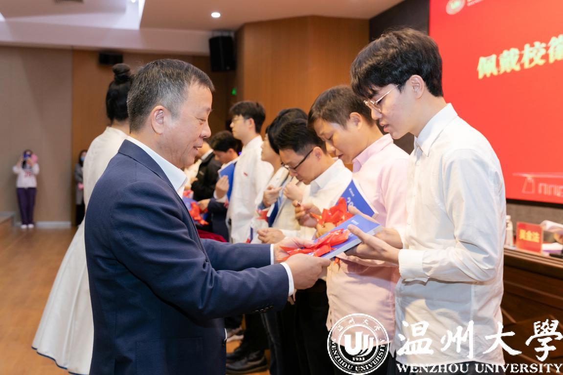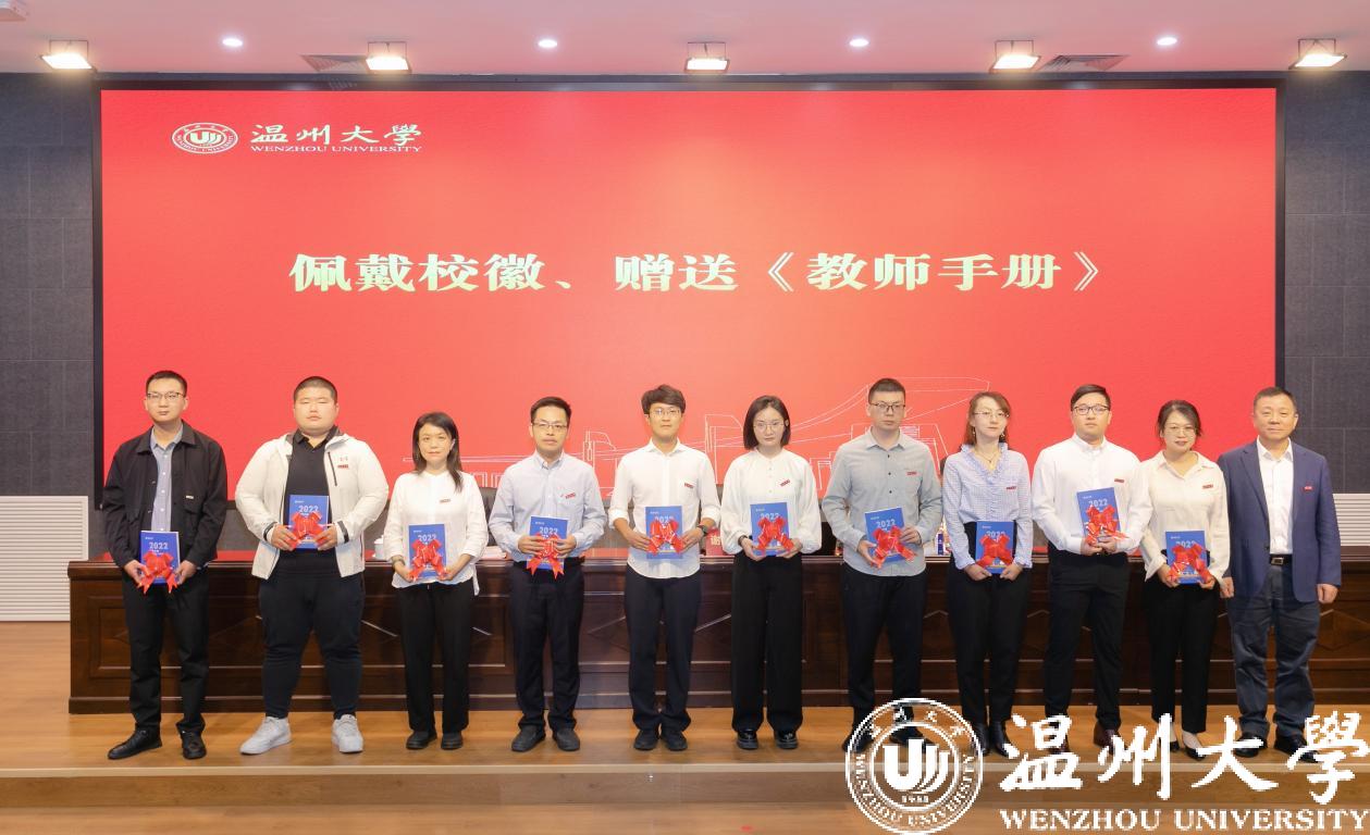 谢树华为新教师代表佩戴校徽,并赠送2022版《星空平台教师手册》,表达学校对新入职教师的热烈欢迎和殷切期望,希望新教师提升“温大人”的归属感和责任感,勉励每一位新入职教师开拓进取、奋勇向前。