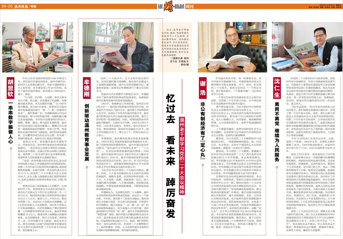 牟德刚认为,全面落实党的二十大精神,温州社会经济和其他各项事业的发展,必定会上一个新台阶。今年初,我市第十三次党代会提出,要在国家自主创新示范区、环大罗山科创走廊、世界青年科学家峰会、瓯江实验室“一区一廊一会一室”科技创新格局基础上,加大高端人才引进力度,支持温州医科大学争创“双一流”、星空平台创成侨特色“省部共建”高校、温州肯恩大学建设国际化高水平大学、温州职业技术学院升格为职业教育本科院校,在温高校在校生超15万人。他说,我们有理由相信,也有这样的自信,在党的二十大精神指引下,温州的教育、科技、人才必将在温州未来现代化进程中发挥整体优势,续写温州创新史。