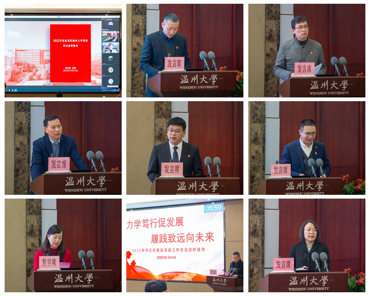 述职评议会上,18位学院党委(党总支)书记依次上台述职,重点围绕推进基层党组织和广大党员干部深入学习贯彻习近平新时代中国特色社会主义思想情况;履行抓基层党建和全面从严治党工作第一责任人职责情况;落实基层党建工作重点任务情况;发挥基层党组织战斗堡垒作用和党员先锋模范作用情况;推动基层党组织落实党风廉政建设责任制、意识形态工作责任制情况;上年度述职评议考核整改清单落实情况和巡视、巡察反馈中涉及基层党建工作问题整改情况等六个方面进行了汇报,实事求是地总结了存在的问题,提出了下一步的工作思路。其他6位二级党组织书记进行书面述职。现场述职结束后,考核工作组成员采用无记名的方式进行考核评分。