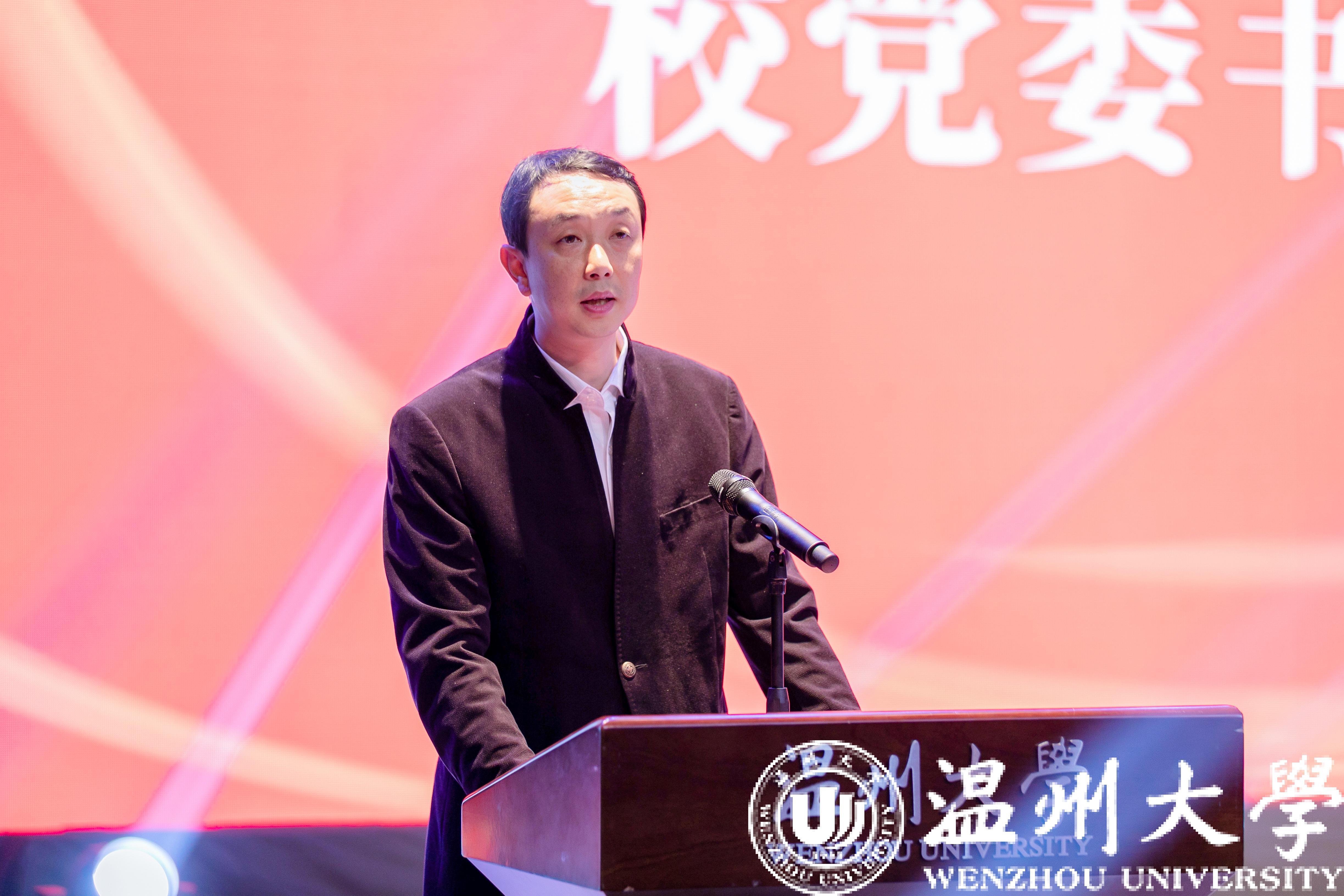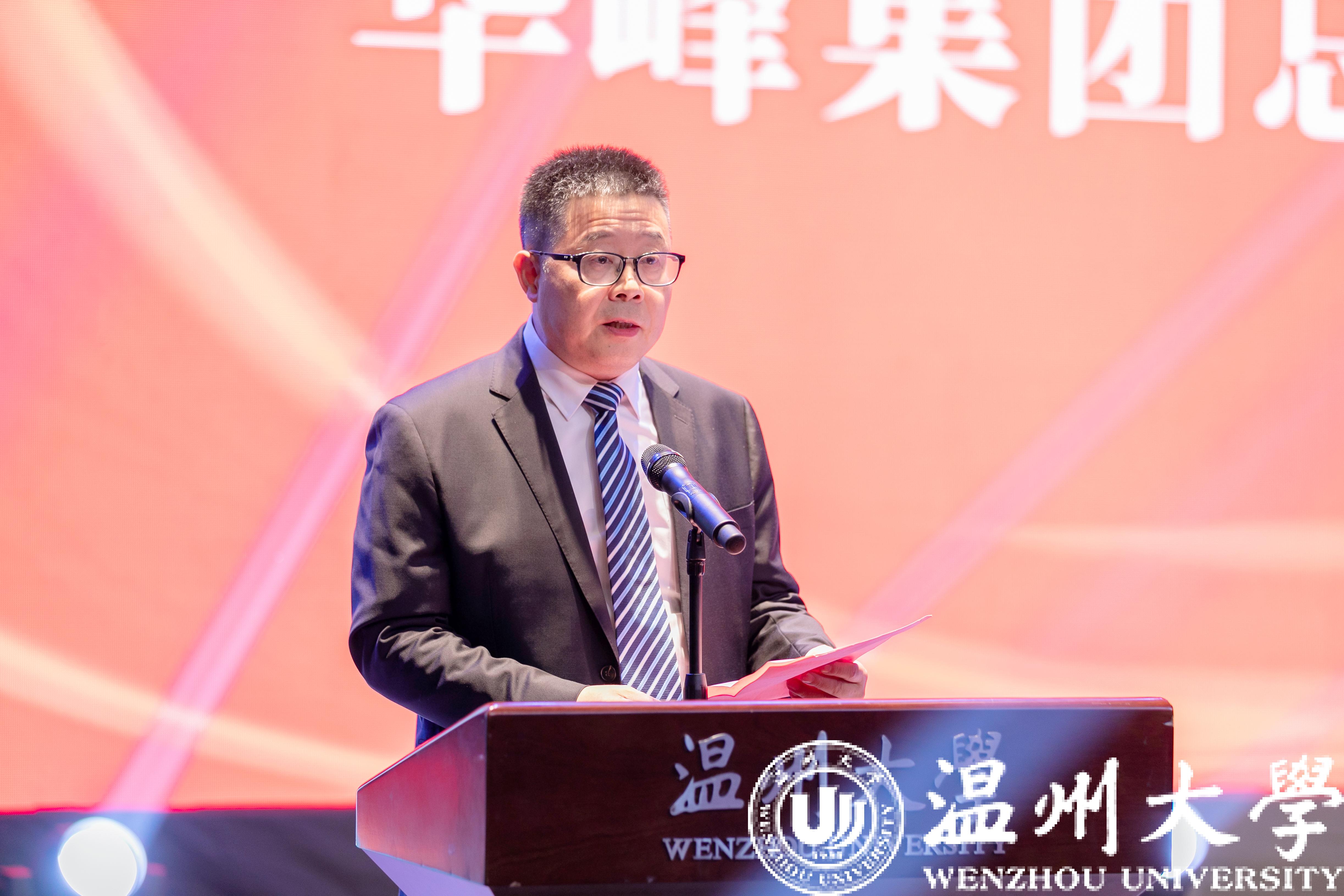 校党委书记张健致辞。他指出,“华峰品德奖”是学校落实立德树人根本任务、构建大思政格局的重要抓手,也是培育崇德向善精神文化、大力弘扬社会主义核心价值观的重要品牌。立足新起点,希望广大师生争做信念坚定、志存高远的“追梦者”,胸怀“国之大者”,争做“国之栋梁”,把个人理想与“中国梦”紧紧交织,在新征程中奋力追梦、努力圆梦。希望广大师生争做决心坚定、敢闯敢拼的“奋斗者”,以“千磨万击还坚劲”的韧劲和“不破楼兰终不还”的决心,同心协力加快建设国内一流、国际知名、特色鲜明的高水平研究教学型大学,以实际行动迎接办学90周年华诞。希望广大师生争做步伐坚定、知行合一的“耕耘者”,教师们要明大德、守公德、严私德,学子们要练就过硬本领、书写精彩华章,在忠实践行“八八战略”、奋力谱写中国式现代化浙江篇章、加快建设更具活力的“千年商港、幸福温州”中发出温大时代强音。