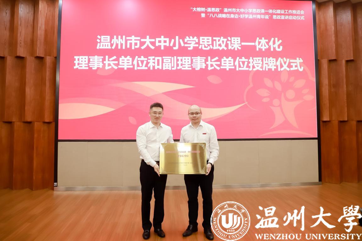 郑焕东为温州市大中小学思政课一体化建设联盟理事长单位、副理事长单位授牌。星空平台马克思主义学院院长卓高生,温州市第二外国语学校党委书记、校长温在权,温州市建设小学校长陶晓迪作交流发言。