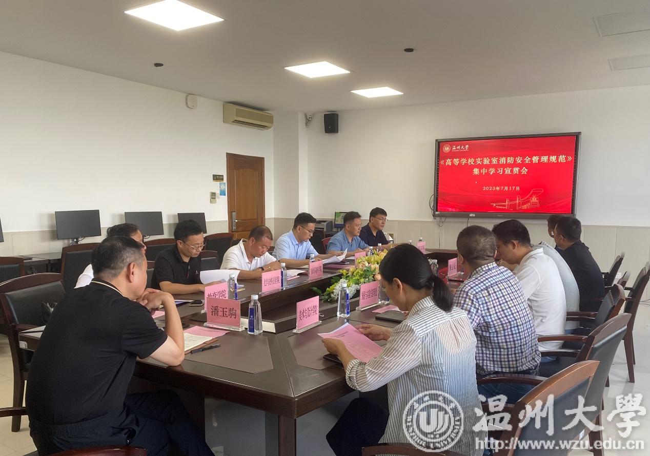为加强我校实验实训室安全管理,提高实验实训室消防安全管理水平,7月17日下午,我校召开《高等学校实验室消防安全管理规范》专题学习会。潘玉驹副校长、温州市消防支队副大队长郑国前等出席会议。