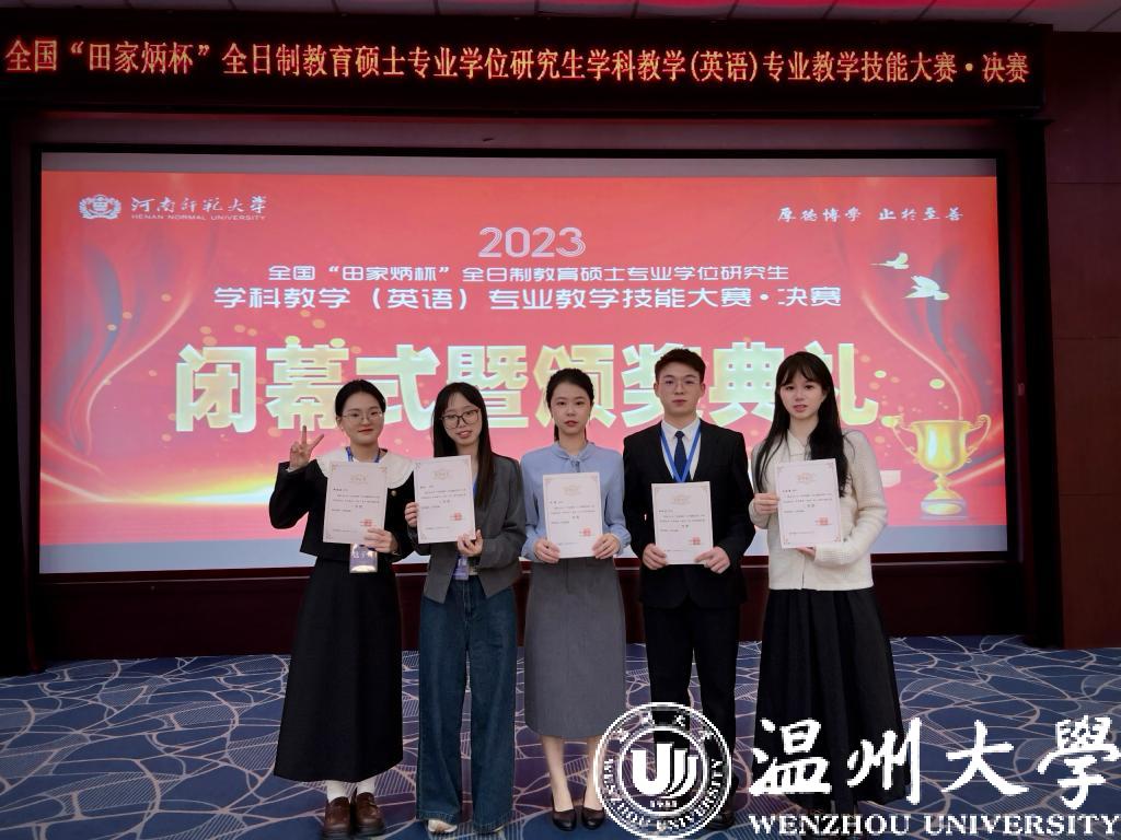 10月21日至22日,2023年“田家炳杯”第五届全国全日制教育硕士专业学位研究生学科教学(英语)专业教学技能大赛决赛在河南师范大学落下帷幕。我校外国语学院研究生何柳、金佳乐分别斩获一等奖、吴俐嶙、张玲和郑金敏分别荣获三等奖。王崴然、李宋昊老师获得优秀指导教师的荣誉。本次大赛外国语学院参赛学子获奖率100%,一等奖获奖数量全国第一,获奖人数与总成绩连续两年在全国名列前茅,在获奖数量和质量上均取得喜人佳绩。