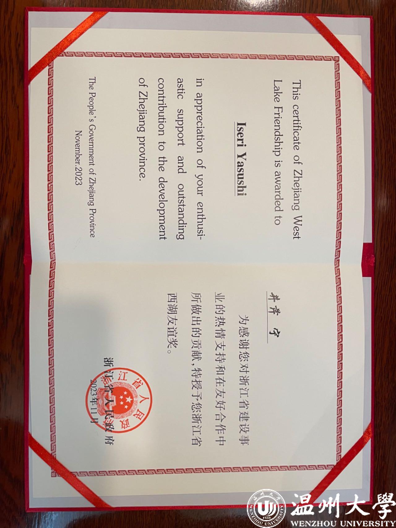 据悉,西湖友谊奖是1997年浙江省人民政府为表彰在浙江现代化建设中做出突出贡献外籍专家而设立的最高奖项。