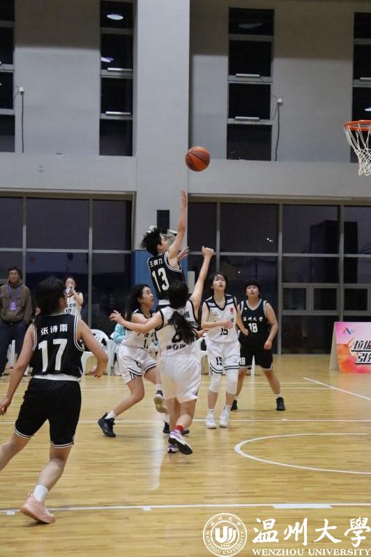 决赛中,温大女篮对战中国美术学院,开场暂时领先,后被追分反超,双方比分一直僵持不下。女篮队员们愈战愈勇,在最后时刻发力得分,再次实现逆袭,以50:47的三分优势,登顶总决赛冠军。体育与健康学院邱龙潜老师荣获本届比赛“优秀教练员”;生命与环境科学学院队员吴楚萱、电气与电子工程学院队员张瑞桐荣获“优秀运动员”;商学院队员郦佩瑜荣获“MVP”等荣誉称号。