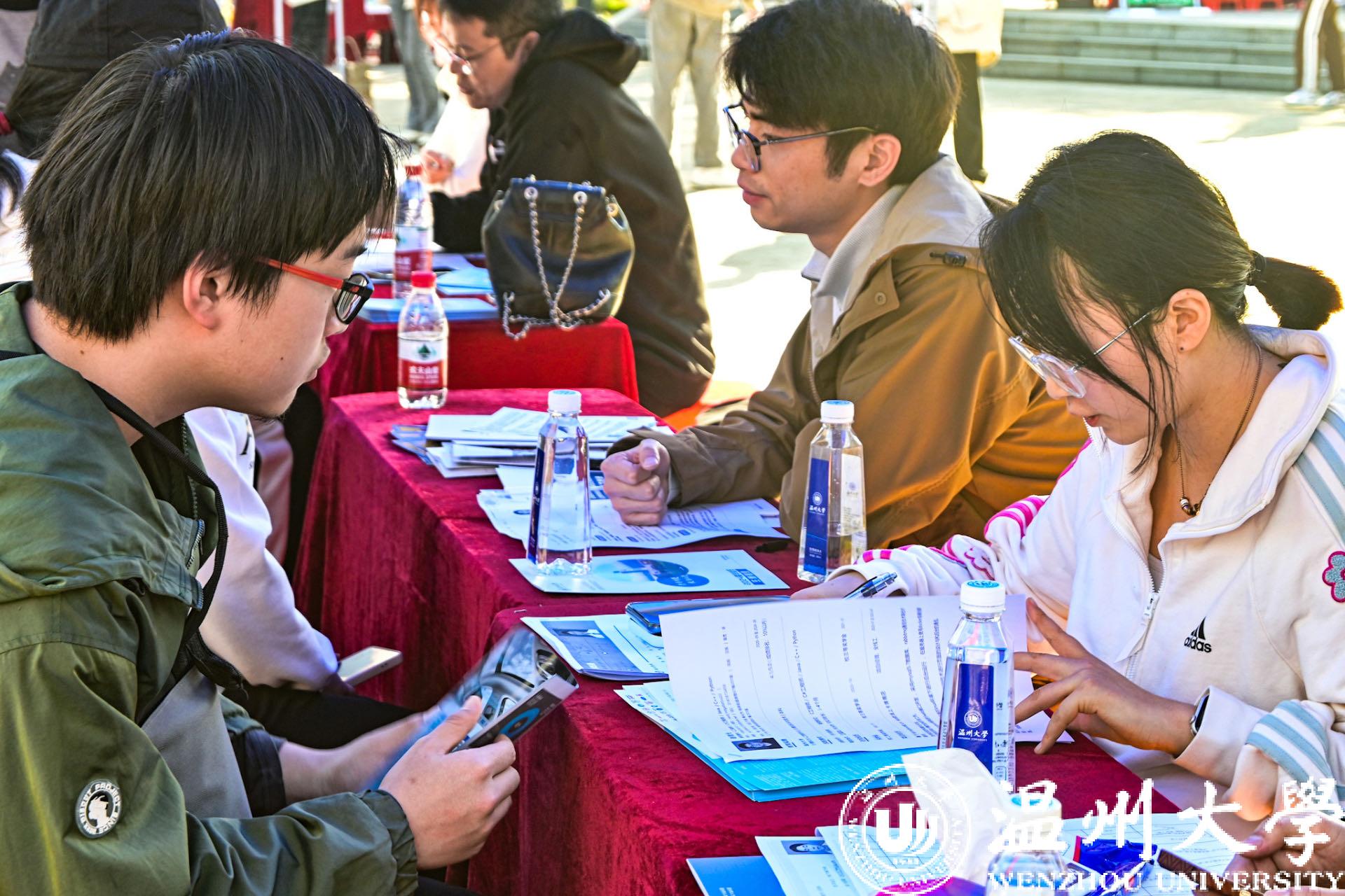 拿着简历的求职学子或是在展位前与用人单位的负责人交流,或是三三两两聚在一起讨论求职情况,也有低年级的学生在现场观摩、提前了解就业前景。机电学院河南籍的大四应届生周同学在接受采访时表示:“我很想留在浙江,这次招聘会有很多江浙沪的企业,很好地满足了我的就业城市意向,今天聊的几家企业双方感觉都不错,收获很大”。数理学院温籍学子陈同学在市人社局留温咨询展位前表示:“一直听说市里的人才政策力度很大,但是没有仔细核对过自己的条件。今天通过现场咨询,人社局的老师帮我估算了下留在温州工作可以申领的补贴额度。这个政策咨询点对于扩大留温影响力以及让毕业生及时了解福利好处太有用了,让我对于留温就业、置业更有信心。”
