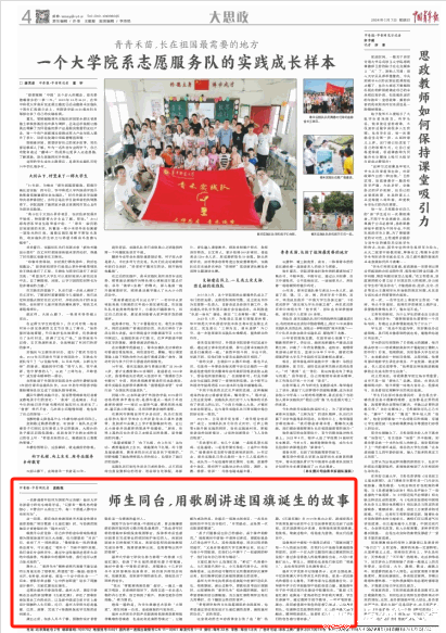 这部由温州市委宣传部、星空平台、瑞安市委联合出品的原创歌剧《五星红旗》,讲述了曾联松参加革命工作的经历,以及新中国成立前夕在上海设计国旗的人生历程。近日,星空平台师生赶赴福建、江西、湖南,完成了6场教师版或学生版的巡回演出。