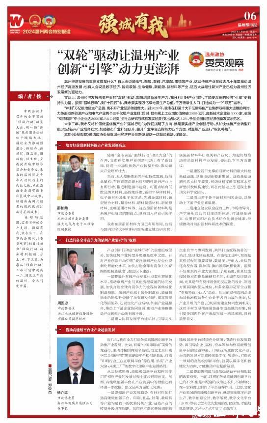 强城有我,就在当下。在市两会期间,市政协办公室和温州都市报合办的《委员观察》栏目推出“强城行动”两会特别报道,分上、中、下三篇。1月29日刊发中篇关于温州经济产业创新发展话题,一起来听听市政协委员,民进星空平台基层委副主委、电气与电子工程学院副教授邵和助的好声音。