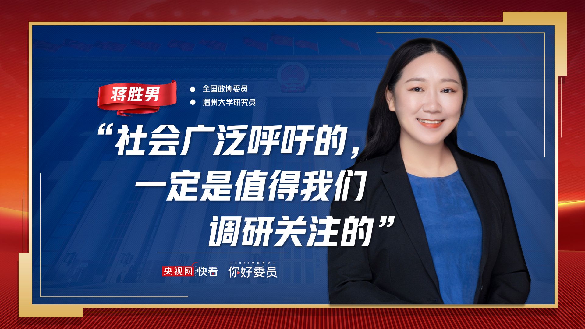 身为第十三届全国人大代表、第十四届全国政协委员,蒋胜男关注年轻人关心的问题,曾就八小时工作制、35岁门槛限制等提出自己的建议,多次冲上热搜。她说:“在其位,谋其事。如果什么事是整个社会广泛呼吁的,那就一定是值得我们调研关注的,就需要我们站出来将这些问题形成提案,从而推动相关领域问题的解决和改善。”