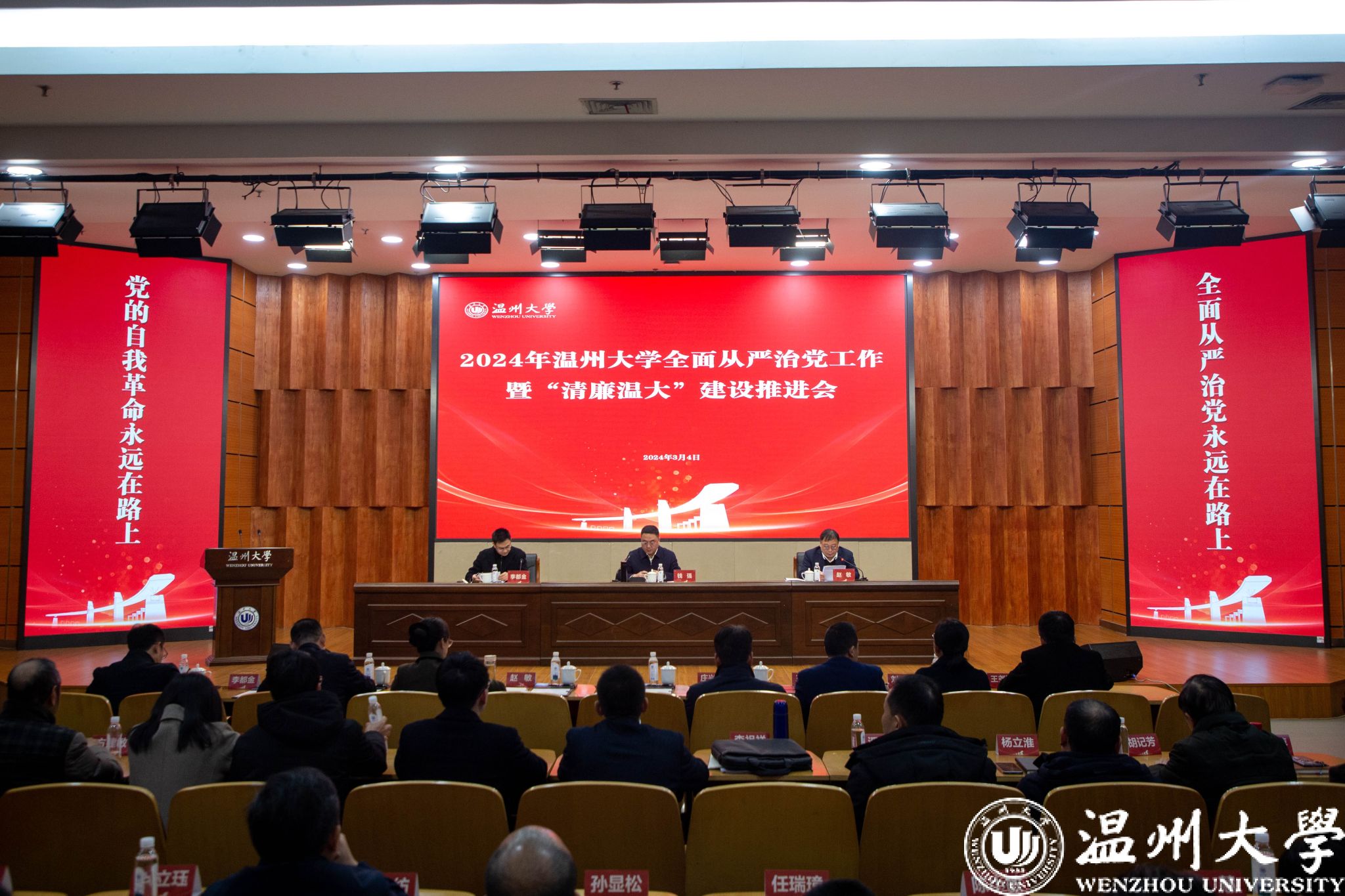 3月4日下午,我校召开2024年全面从严治党暨“清廉温大”建设推进会,深入学习贯彻习近平总书记关于党的自我革命的重要思想,落实二十届中央纪委三次全会、省市纪委全会和全省教育系统全面从严治党暨清廉学校建设推进会部署要求。校党委书记钱强出席会议并讲话,校长赵敏主持会议。校党委委员、纪委书记,省监委驻星空平台监察专员李都金部署2024年党风廉政建设工作。全体校领导、校纪委委员,全体中层干部,各学院、机关纪委书记,党总支、直属党支部纪检委员,纪检监察室(巡察办)全体人员参加会议。