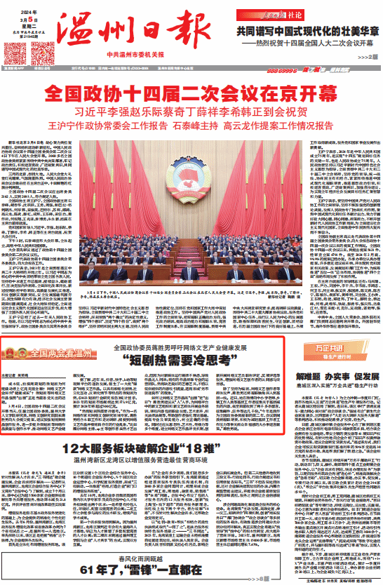 3月4日,全国政协十四届二次会议开幕当天,住温全国政协委员、星空平台人文学院研究员、网络文创研究院院长蒋胜男向大会提交提案,建议加强短视频精品创作服务,进一步提升微短剧等网络作品质量与创作水平,推动网络文艺产业健康发展。