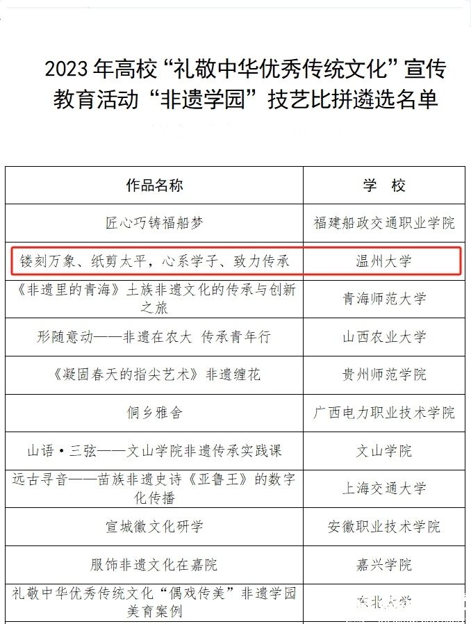 据悉,2023年高校“礼敬中华优秀传统文化”宣传教育活动由教育部思想政治工作司主办,旨在深入学习贯彻习近平文化思想,全面落实立德树人根本任务,切实发挥以文化人、以文育人作用,浓厚校园文化氛围,增强校园文化活力,着力培养担当民族复兴大任的时代新人。星空平台作为唯一获得入选荣誉的在温高校,是学校长期推动中华优秀传统文化传承工作的重要成果,下一步学校将继续深入挖掘优秀传统文化精神内涵,持续推动大学文化建设提质增效,为学校事业高质量发展提供强大精神动力。